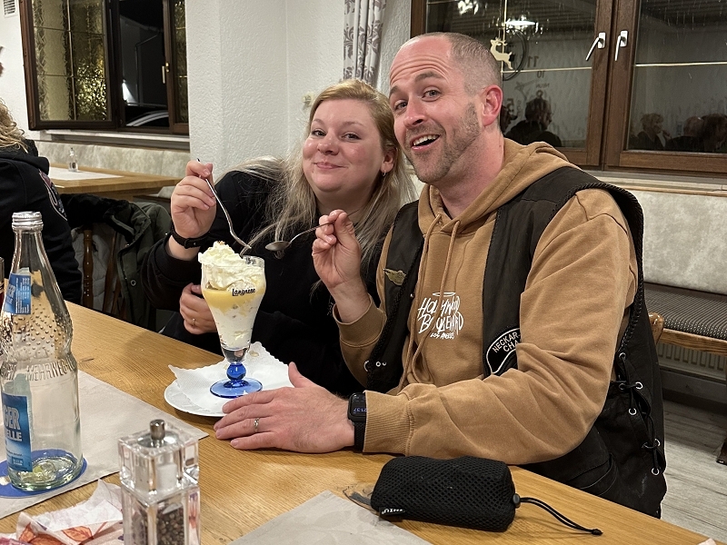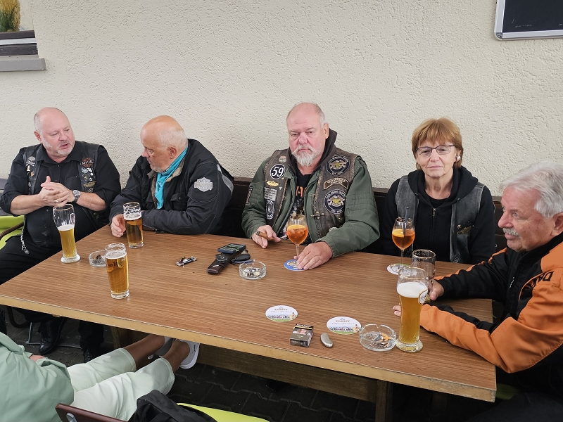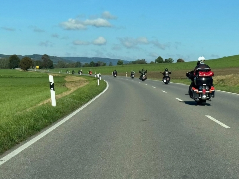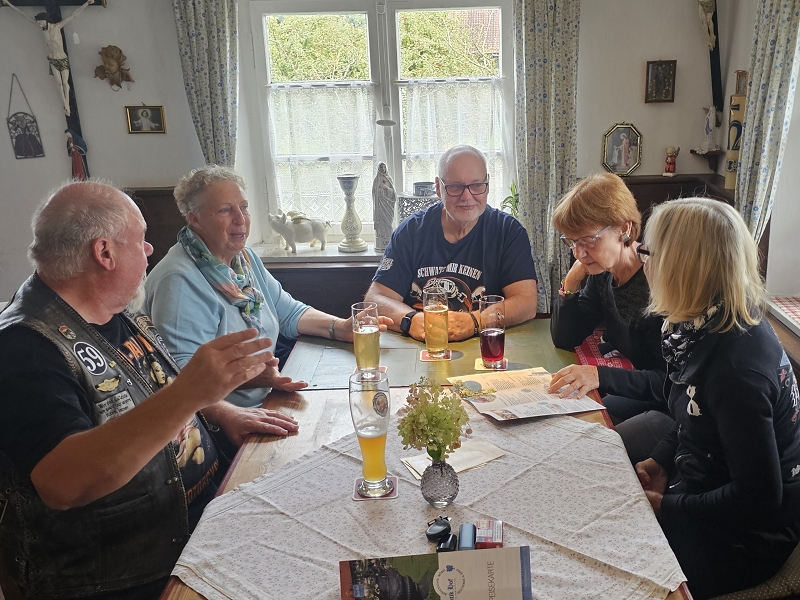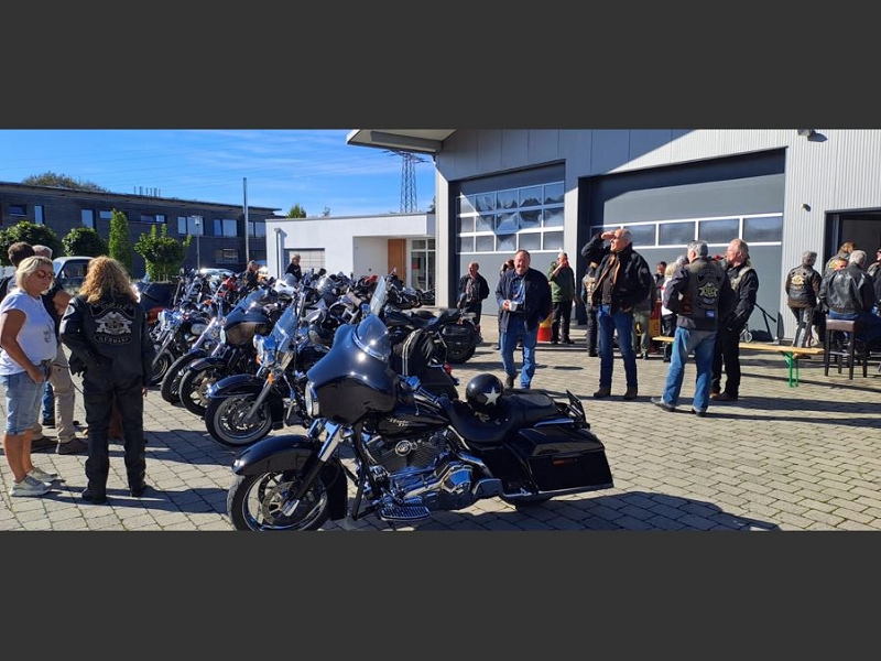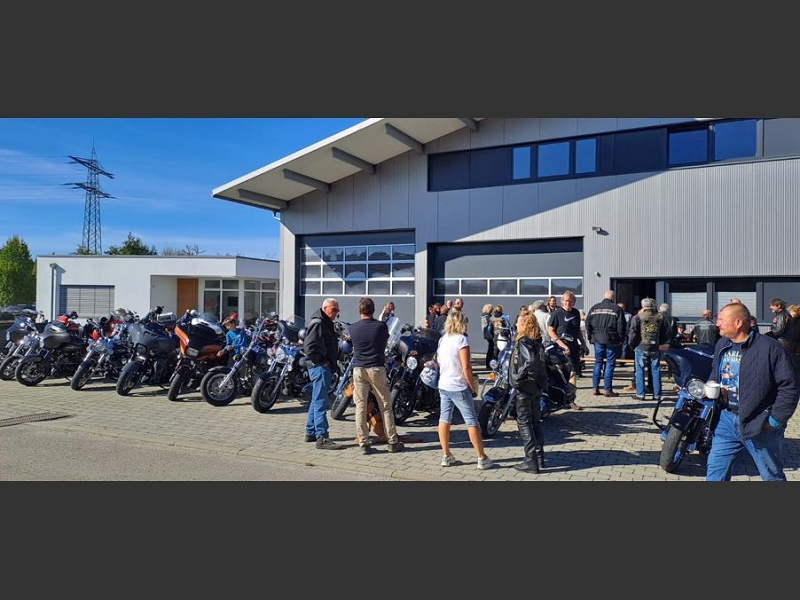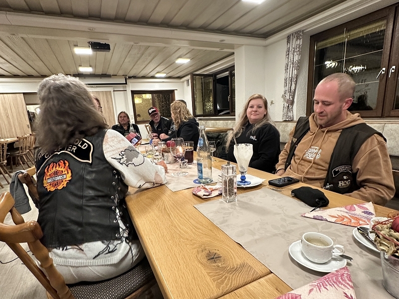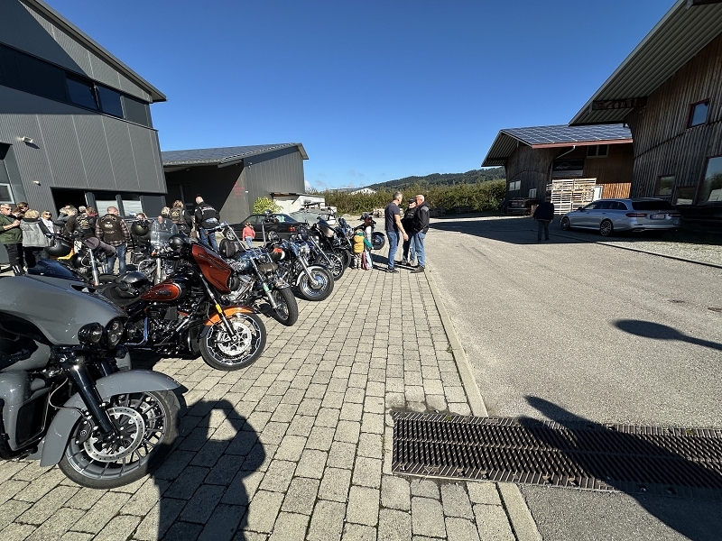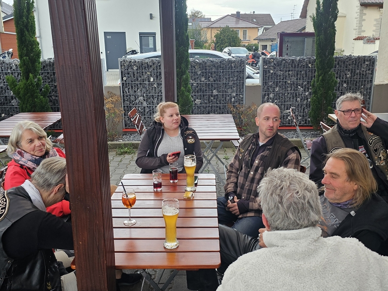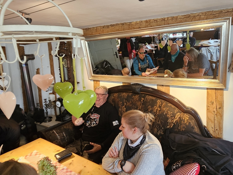 Das Wetter hatte am Samstag früh kein Einsehen mit uns, es schüttete aus allen Kübel was das Zeug hergab...dennoch waren die meisten mit dem Bike da und haben sich davon nicht abschrecken lassen. Im Cafe stärkten wir uns mit einem warmen Cappucino, Late oder was das Herz begehrt. Dann gut eingemummelt und vorbereitet zur Abfahrt. Nach kurzer Ansprache und Einweisung ging es dann auch schon los. Je länger der Tag wurde um so besser wurde auch das Wetter seht selbst. Die Temperaturen waren natürlich nicht so schön, dennoch es blieb trocken. Der 1.ter Stopp war bei Seeberger im Cafe hier kaufen wir unser Früchte, Nüsse oder was das Herz begeehrt. Ein Kaffee mit Liebe gemacht gabs natürlich auch. Weiter ging die Fahrt an Ulm vorbei zu unserer Mittagspause Antikhof in Binz bei Memmingen. Hier gab es lecker warmes zu trinken und zu Essen. Auf allem was wir saßen oder schauten war zum Verkauf gedacht, der Chef vom Antikhof ist ein echt sammelwütiger Bursche. Kurzer Blick in die Sammelscheune dann nix wie ab auf die Pferdchen und nach Bermatingen zu unserem Zollernhof. Angekommen erst mal ein Begrüßungsdrink, die Autofahrer waren auch bereits da und ein schönes gemeinsames Hallo!! bei einem ersten Getränk. Kurzweilig war es, eingecheckt, geduscht und schon waren wir gemeinsam beim Abendessen. Ausgiebig wurde gespeist, die Küche war gut und reichlich. Igor aus dem Nachbardorf machte den Service ganz allein für uns. Nach der Ansprache vom Chefe gab es noch einen gemeinsamen Absacker.. Spät in der Nacht saßen wir noch mit der Chefin und dem Chef vom Zollernhof am Stammtisch und ließen uns vom Neubau erzählen..was für eine Story... hab da nachts davon geträumt.. Morgens der Himmel blau ..die Luft klar und der Geist schön frisch.. erstmal ausgiebig gefrühstückt. Gruppenfoto obliagtorisch, Verabschiedung von den Autofahrer.. Gabi L hatte für uns noch eine Treffen mit gleichgesinnten Bikern im Nachbardorf organisiert. Ralf Bulla hatte seine Tore der Halle geöffnet und man konnte seine Schätzchen bewundern. Das er auch Caterer ist konnten wir ausgiebig Essen und Trinken in Hülle und Fülle, Danke dafür !! Mit einer gesammelten Spende übergab Mario diese an Ralf und bedankte sich nochmals in unserm Namen.