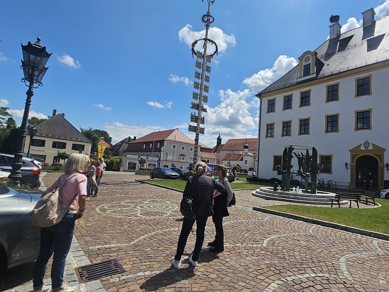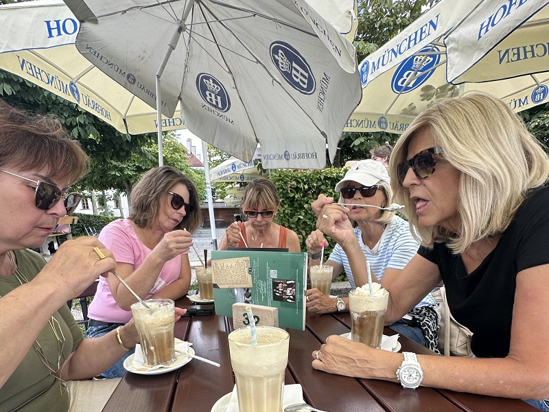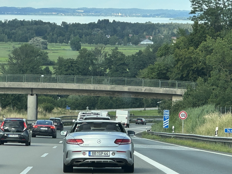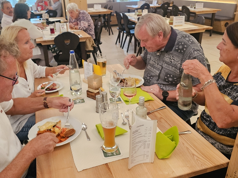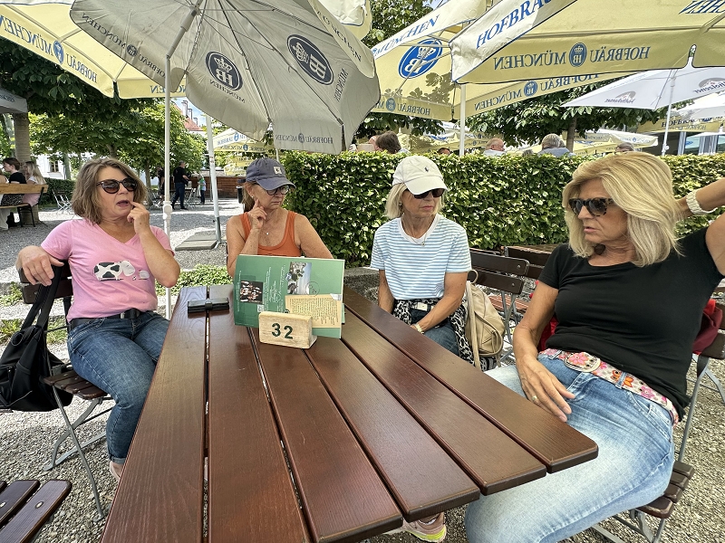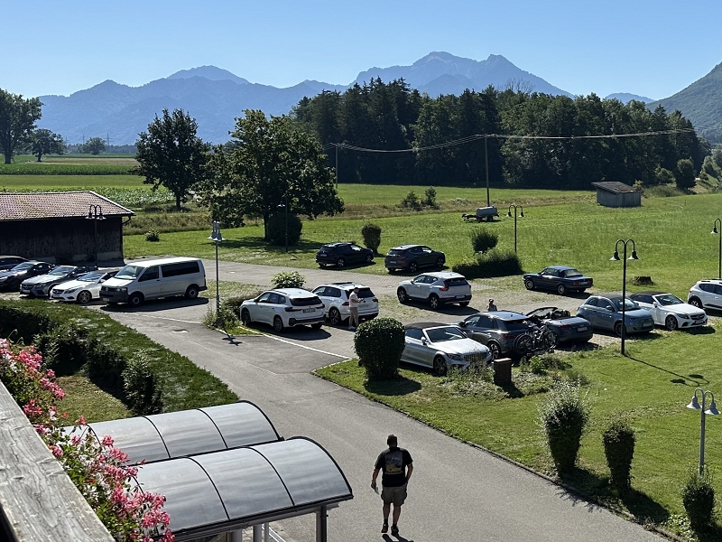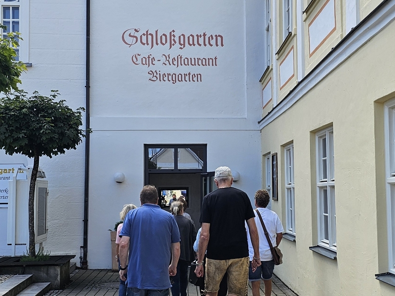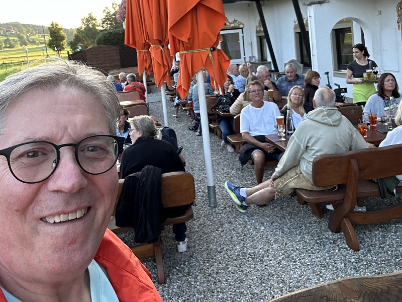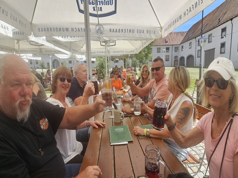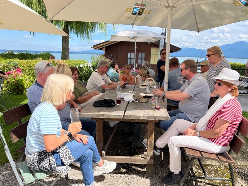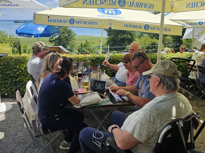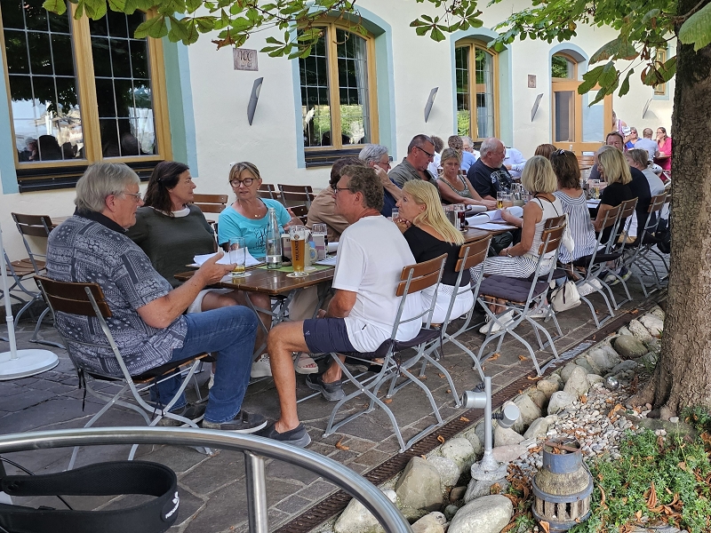 Tourverlauf: Donnerstag 17.07.2025 Ab 09.00 Uhr war Treff beim Cafe del Sol in Echterdingen. Pünktlich um 09:30 Uhr fuhren wir los und überquerten die Schwäbische Alb auf schönen und manchmal auch recht schmalen Straßen bis Memmingen, um von da über einen kurzen Abschnitt der A 96 bis zur Ausfahrt Bad Wörishofen, Richtung Mittagspause zu fahren. Diese machten wir dann im sehr schönen Biergarten des Schloßcafes Türkheim. Weiter ging es danach immer südlich von München und die Alpen im Blick bis nach Bernau am Chiemsee. Hier konnten wir um ca. 17:30 Uhr in unserem Hotel Farbinger Hof einchecken. Auf unseren Begrüßungsdrink verzichteten wir diesmal. Stattdessen stießen wir nach dem Abendessen alle zusammen auf unsere Susy an.