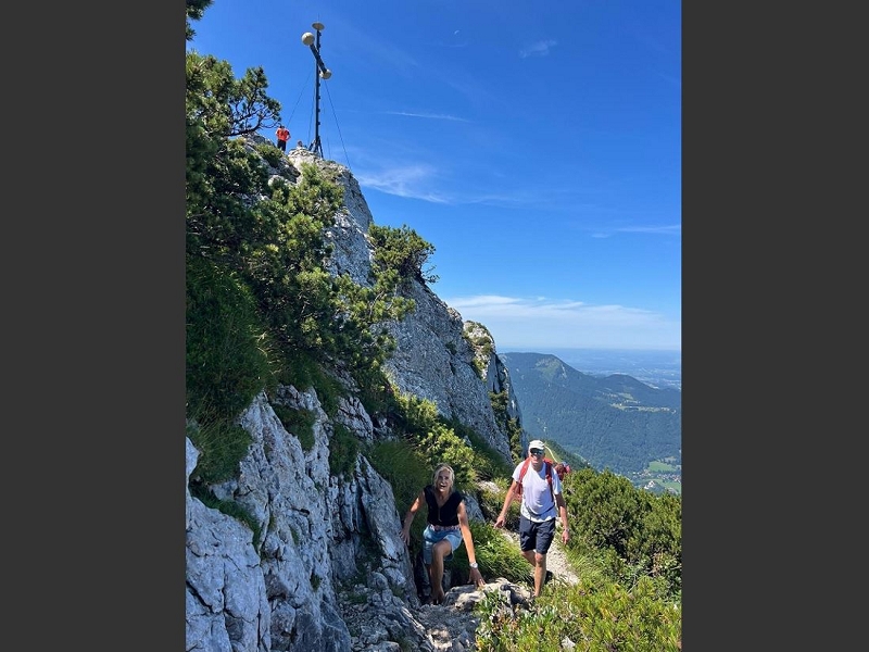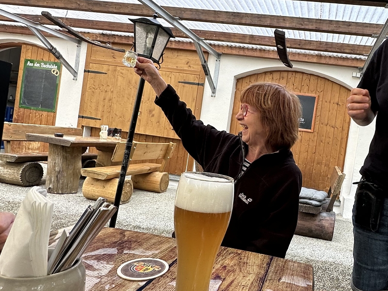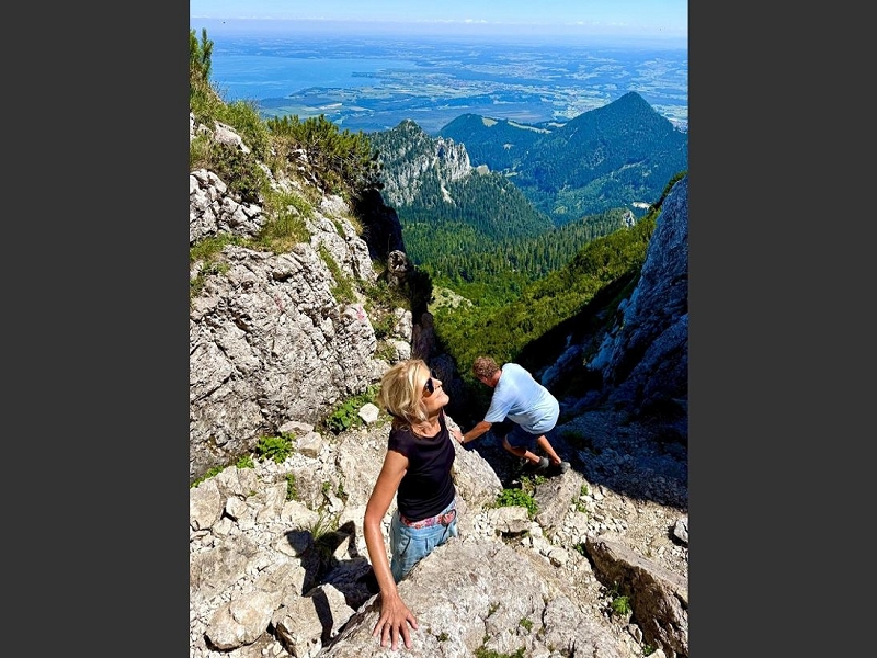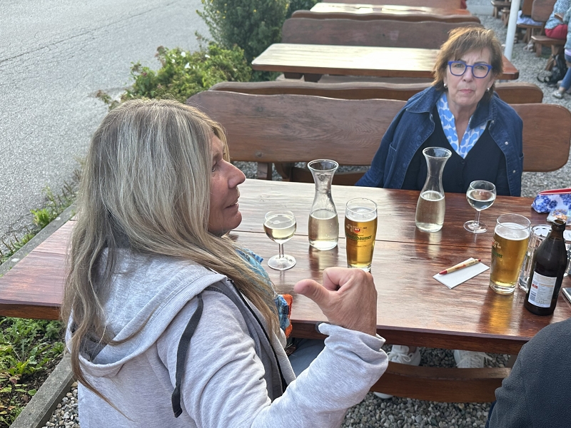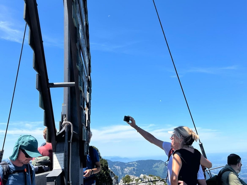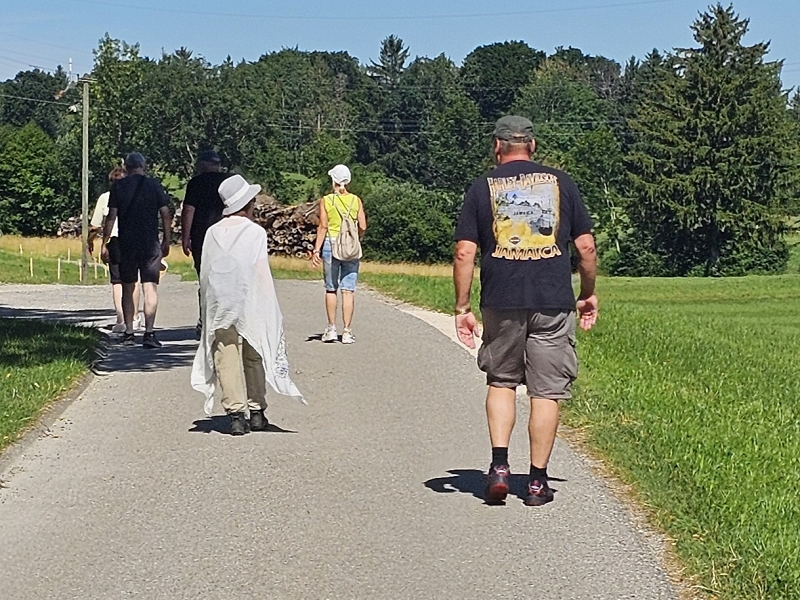 Samstag 19.07.2025 Heute war sportliche Aktivität angesagt. Ein Teil unserer Gruppe machte sich bei doch sehr heißen Temperaturen und stark brennender Sonne auf, um zur Seiseralm (nicht die in den Dolomiten) zu wandern und dort im Biergarten des Seiserhofes bei einem leckeren Bier und gutem Essen den wirklich atemberaubenden Blick auf den Chiemsee zu genießen und danach wieder zurück zu wandern. Die anderen waren noch extremer drauf. Sie fuhren zunächst nach Aschau und dann mit der Bahn hoch hinauf auf die Kampenwand. Aber das war noch nicht genug Abenteuer für sie, nein, sie mussten unbedingt den Gipfel erklimmen und haben sich teils auf allen Vieren den Weg nach oben gebahnt. Nach diesen Abenteuern ging es heute zum Abendessen in den schönen Biergarten des Landgasthofes Messerschmied. Wie am Tag zuvor gingen manche die 2,5 km zu Fuß, die anderen teils erschöpft von den Extremwanderungen des Tages bevorzugten lieber die angebotenen Mitfahrgelegenheiten.
