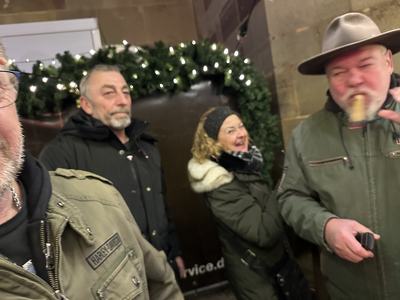 Treffpunkt war wie immer bei Weihnachtsmann & Co. Nach einem ganz netten Foto mit Äffle und Pferdle ging es rüber zum singenden Elch. Langosch, Gänse Wurst, Bratwurst und diver. Kalt- sowie Heißgetränke gingen über die Theke. Die Rabatt-Stempelkarte war alsbald voll.