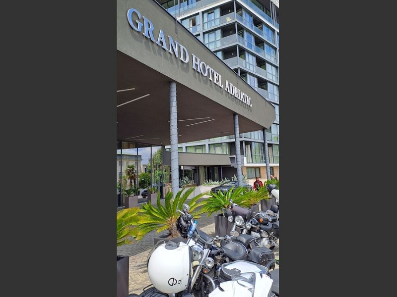 Bei Sonnenschein entlang der Küstenstraße am Golf von Triest bogen wir kurz vor Triest Richtung slowenische Grenze ab. Je näher wir den Bergen kamen desto dunkler wurde der Himmel und heftige Blitze waren zu sehen. Wir (nicht alle) beschlossen die Regensachen anzuziehen. Kurz nach dem passieren der slowenischen Grenze ereilte uns ein Unwetter mit Starkregen. Das Wasser stand bis zu 30 cm auf der Straße. Die Kulis liefen über. Eine nahe liegende Tankstelle gab uns Unterschlupf. Nachdem sich das Unwetter verzogen hat wagten wir die Weiterfahrt. Es blieb weitgehendst trocken bis kurz vor Pula als auf gerader Landstraße wiederum ein Unwetter uns ereilte. Man sah vor Starkregen nichts mehr und wir fuhren rechts zum Halten an. Danach erreichten wir sicher unser Ziel. Travel Agent Mario checkte die Unterkunftsformalitäten und nachdem unsere Pferdchen geparkt und abgesattelt, wir geduscht und gestylt waren, ging es zum Abendessen ins Hotelrestaurant. Katja und Marc stießen zwischenzeitlich zu uns zu. Nach erfolgreicher Buffetschlacht gab es das eine oder andere Getränk und Gespräch an der Bar.