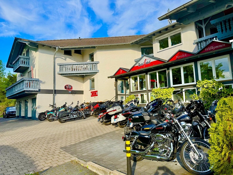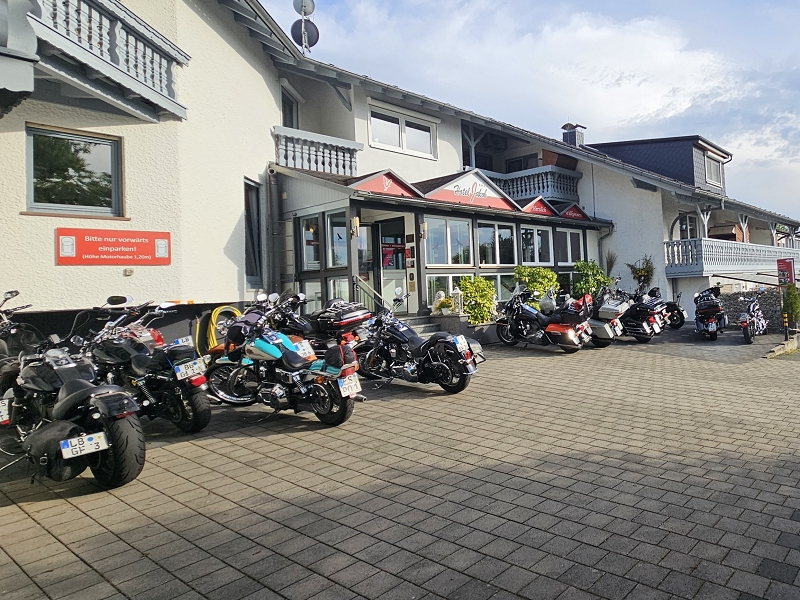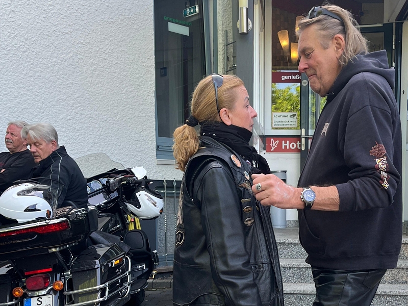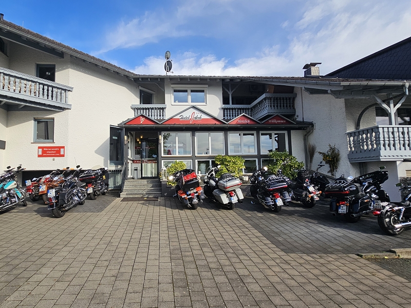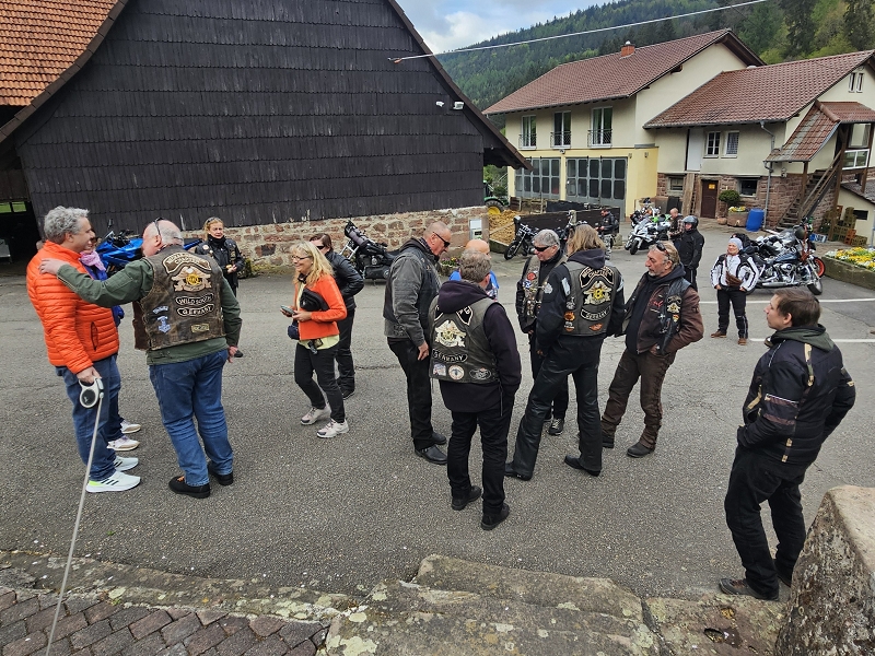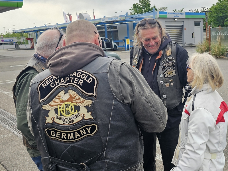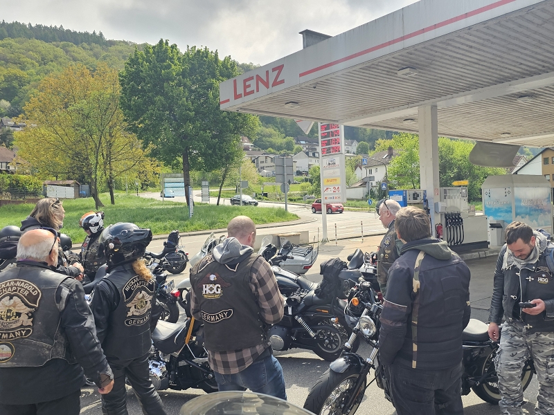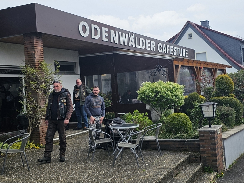 Über Bietigheim, Heilbronn ging es nach Bad Wimpfen wo wir eine kurze Pause einlegten. Danach ging es entlang des Neckars nach Ebersbach. Dort konnte Matze an der Tankstelle Lenz seinen Spritbedarf decken. Ob er einen Familienrabatt bekam ist leider nicht bekannt. Nach weiteren 12 km trafen wir zur Mittagspause im Landgasthaus Zur Mühle in Waldbrunn-Oberhöllgrund ein. Die Bärlauchbratwürste waren sehr zu empfehlen, aber alles andere an Essen und Service war ebenso sehr gut. Um keine Müdigkeit aufkommen zu lassen ging es dann zügig weiter. Kurze Pause in Würzberg beim Oderwälder Cafe Stüble. Kaffee und Kuchen waren angesagt. Nach weiteren 40 km kamen wir gegen 16 Uhr in Groß-Umstadt an. Bevor wir im Hotel Jakob eincheckten wurden unsere Stahlrosse aufgetankt.