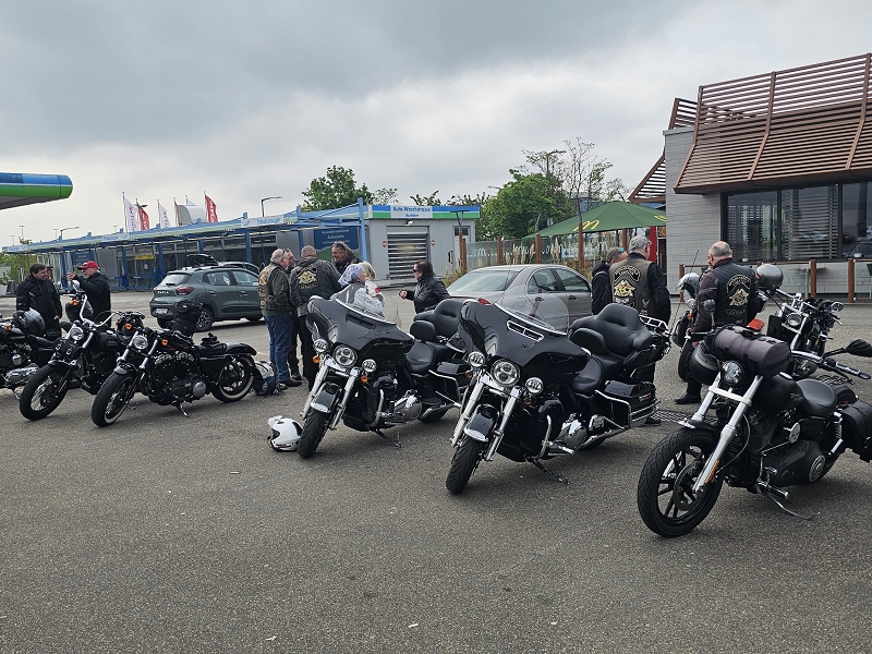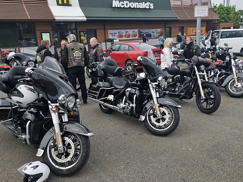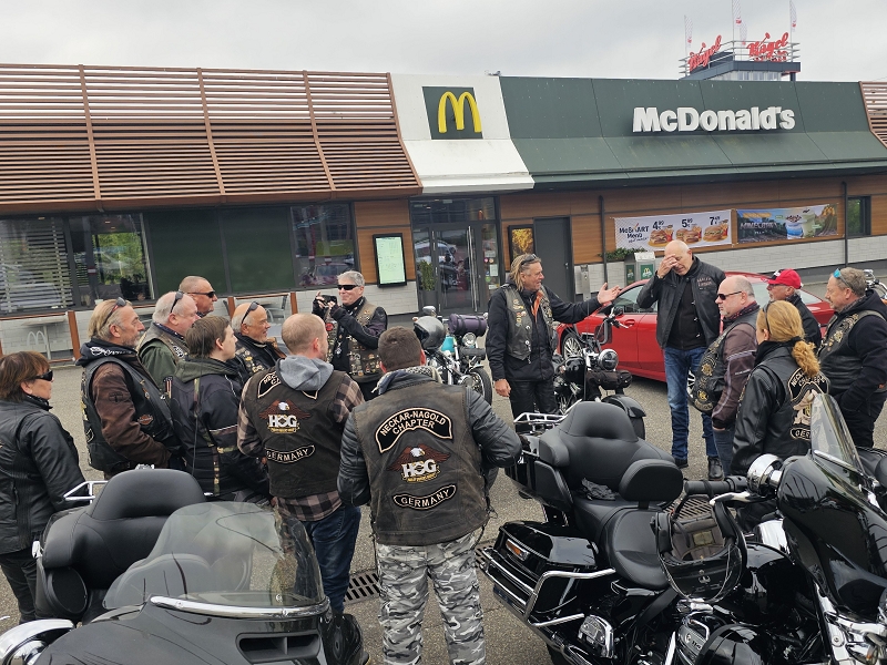 Treffpunkt war McDonald am Breuningerland Ludwigsburg/Tamm. Nach und nach trafen die Member mit ihren Bikes ein. Dennis brachte zur Sicherheit ein Starthilfekabel mit, da sein Baby etwas schwach auf der Batterie war. Nach kurzer Ansprache und Einweisung ging es dann auch schon los. Mit 16 Bikes, darunter unser Gastfahrer Damian ging es dann pünktlich um 10 Uhr auf die Piste.