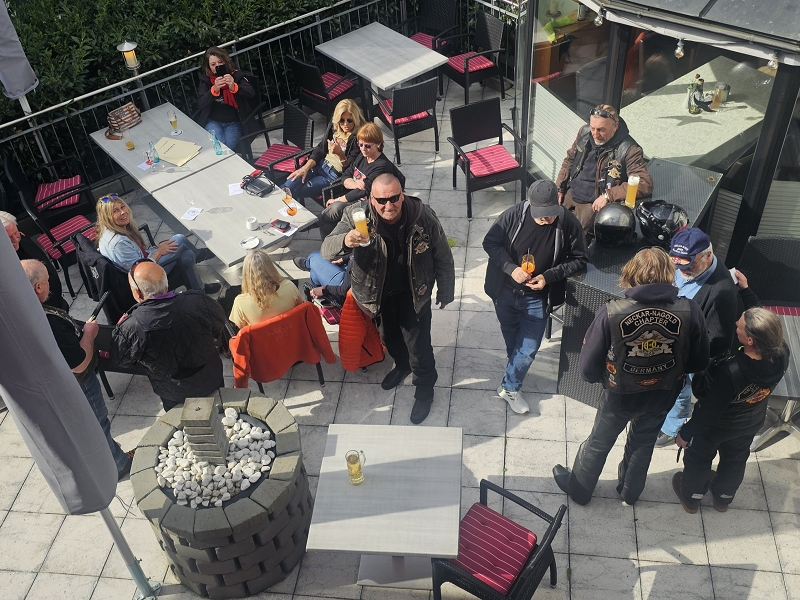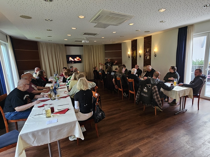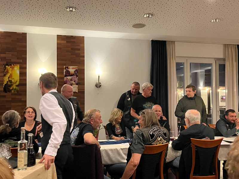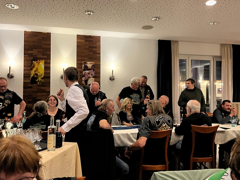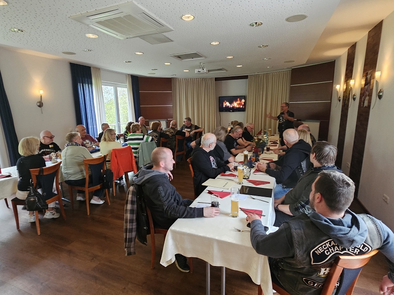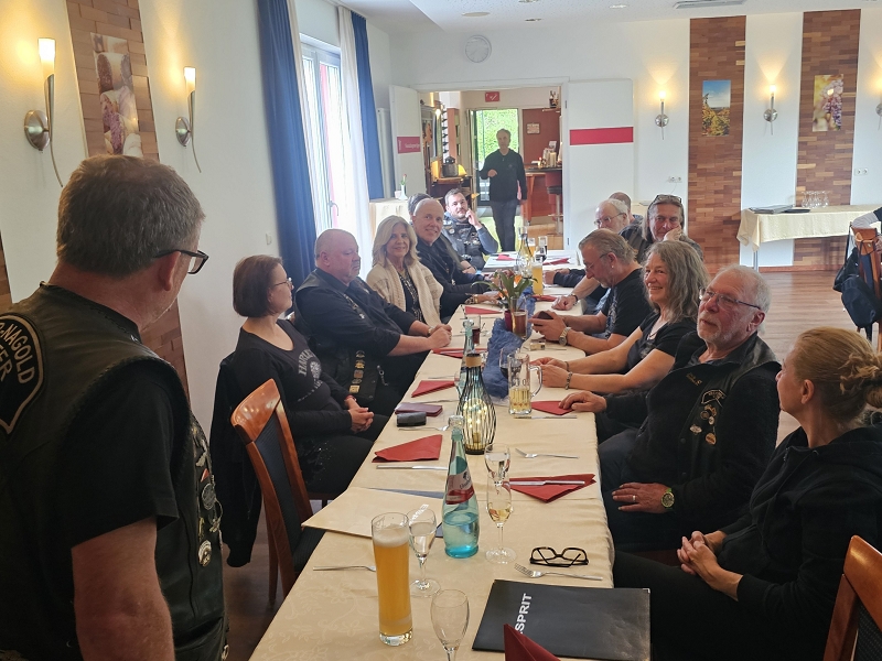 Unser Direktor Mario hielt die obligatorische Ansprache, stimmte uns alle für die kommende Saison ein und bedankte sich beim Organisationsteam Leines, GüBu und Didi. Insbesondere Didi´s gute Leistung, bei seiner Prämiere als Road Captain, hat es ihm angetan. Betont wurde die Vorbildfunktion aller vorangegangenen Road Captains und deren außerordentliche Vorarbeiten auf die Didi quasi uneingeschränkt aufbauen konnte. Des Lobes völlig überrannt und berauscht gab Didi eine Runde für alle aus.