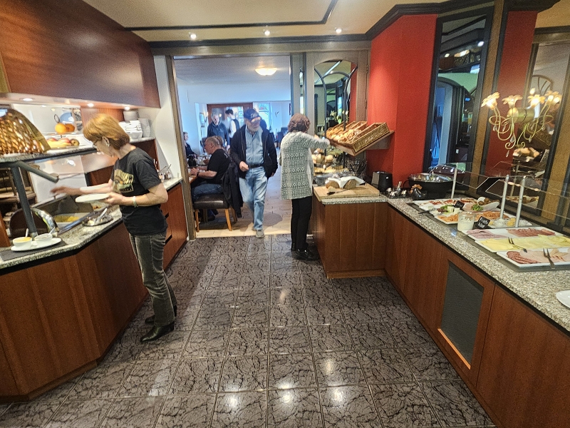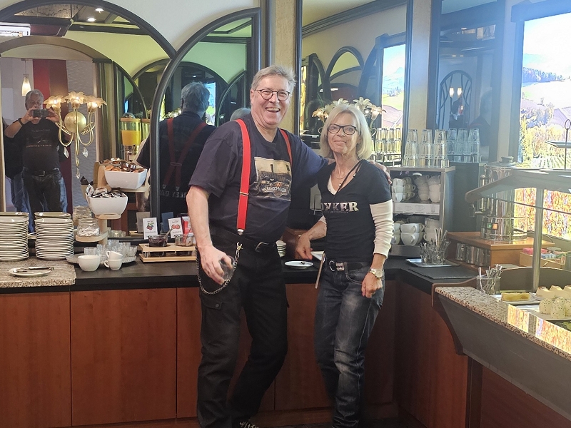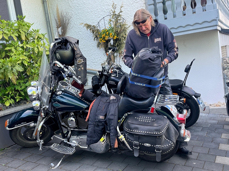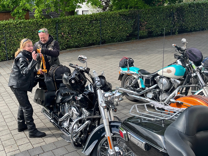 Sonntagmorgen wurde das leckere Frühstücksbuffet ausgiebig genutzt. Manch einer schob noch eine Aspirintablette hinterher. Gut gestärkt wurden die Mopeds bepackt. Dennis Auspuff, äh natürlich von seinem Moped war etwas locker und bedurfte etwas Nacharbeit und Fürsorge.
