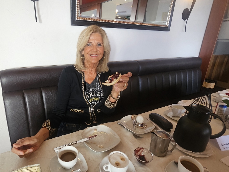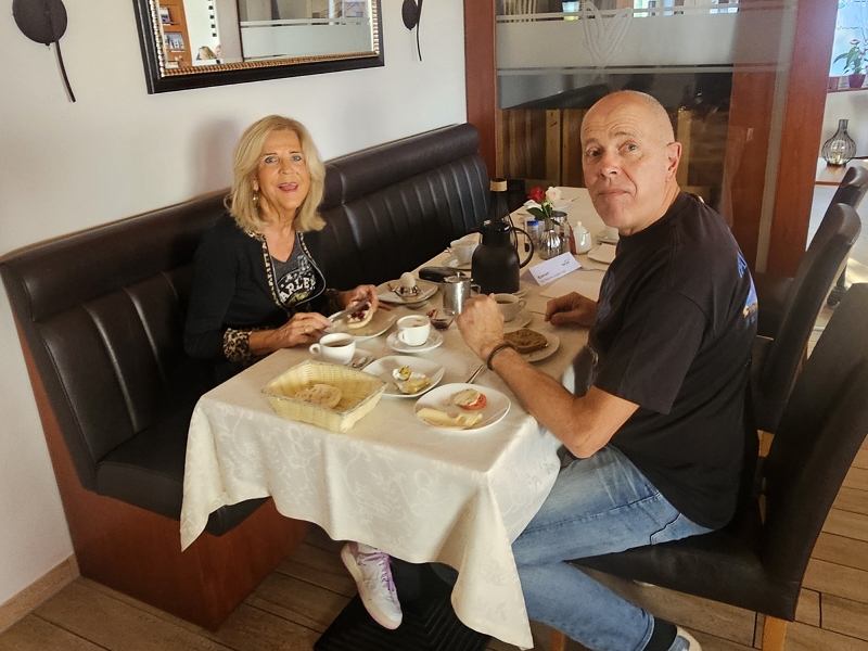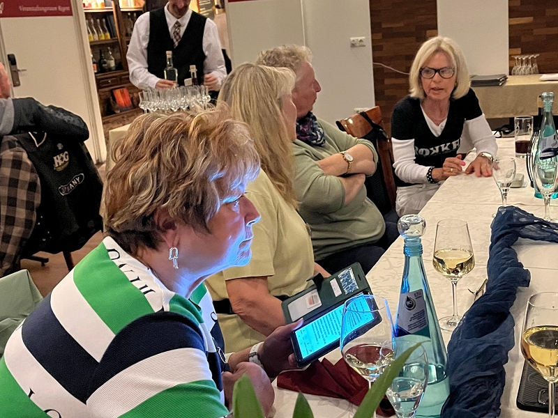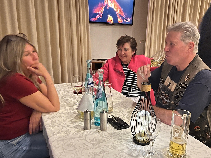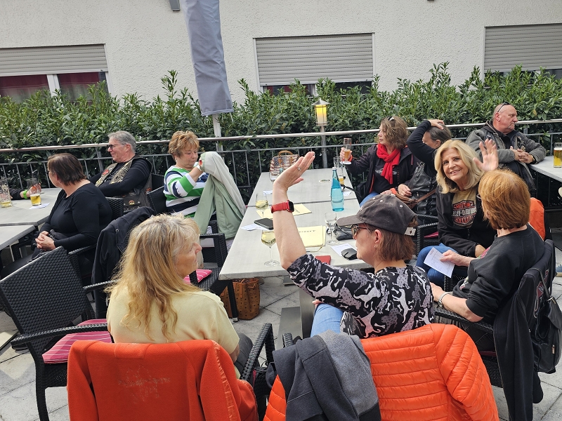 Es dauerte nicht lange und man traf sich auf der Terrasse zum Afterlandingdrink. Daggi, Dr. Schaller, Ingrid, Gabi, Moni, Edeltraud, Hans und Sabine, Marc und Katja sowie Anita und Uwe waren bereits per Auto da und alle begrüßten sich herzlichst. Um 19 Uhr trafen wir uns alle zum Abendessen. Auf der Karte gab es für jeden etwas zur Auswahl. Essen, Service, Ambiente, Location rundum das ganze Hotel war sehr gut und wir haben uns richtig wohl gefühlt – wir werden bestimmt einmal wiederkommen.