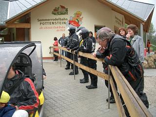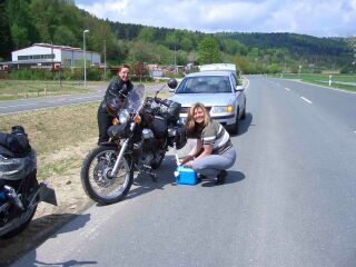 Gegen 11:00 Uhr ging's los. Herrlich, wir glauben, dass der Wettergott den Pfarrer erhört hat...denn schon kurz nach dem Start riss der Himmel auf und die Sonne kam raus. Das Fahren machte so einen Spaß, dass doch glatt das Tanken vergessen wurde :-)) Es ist schon komisch...wie ein Moped so ruckelt, wenn kein Saft mehr da ist. Fast so, als ob man an der Theke steht und nichts mehr zum Trinken bekommt :-) |