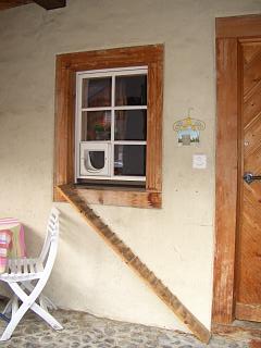 ...mit Katzenklappe im Fenster...