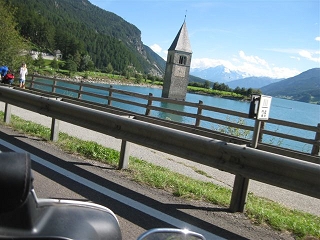 letzter Blick über den Kirchturm im Reschensee zum Ortler |